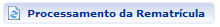 para visualizar o processamento da rematrícula. A tela exibida será igual à do Processamento da Matrícula, porém com alunos que se inscreveram para a disciplina no período de rematrícula, a sua ordem na prioridade e se eles foram matriculados ou indeferidos.