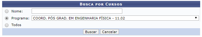 Esta funcionalidade permite que o usuário, coordenador de Pós-Graduação, altere ou remova cursos cadastrados no módulo Stricto Sensu. Para Buscar/Alterar Curso, acesse o SIGAA → Módulos → Stricto Sensu → Cadastros → Cursos → Listar/Alterar.