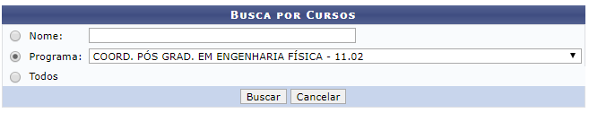 O usuário deverá inserir o Nome do curso, selecionar o Programa ou marcar a opção Todos para realizar a consulta de cursos.