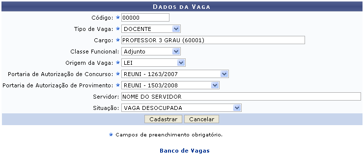 Esta operação tem como finalidade possibilitar o cadastro de vagas que poderão ser ocupadas por servidores vinculados à Instituição. As vagas disponíveis estarão relacionadas ao cargo, podendo ser Docente ou Técnico, pretendido para o cadastro. É importante ressaltar que não será permitido o cadastro de vagas portando o mesmo código.