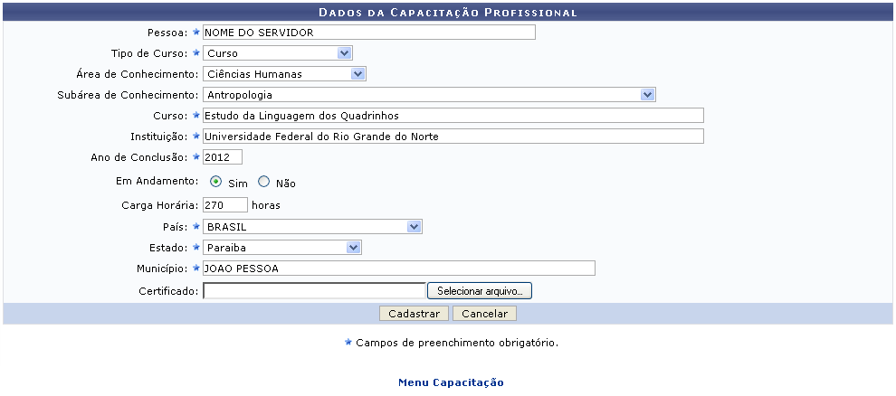 Para cadastrar a capacitação profissional, o usuário poderá preencher os seguintes campos: