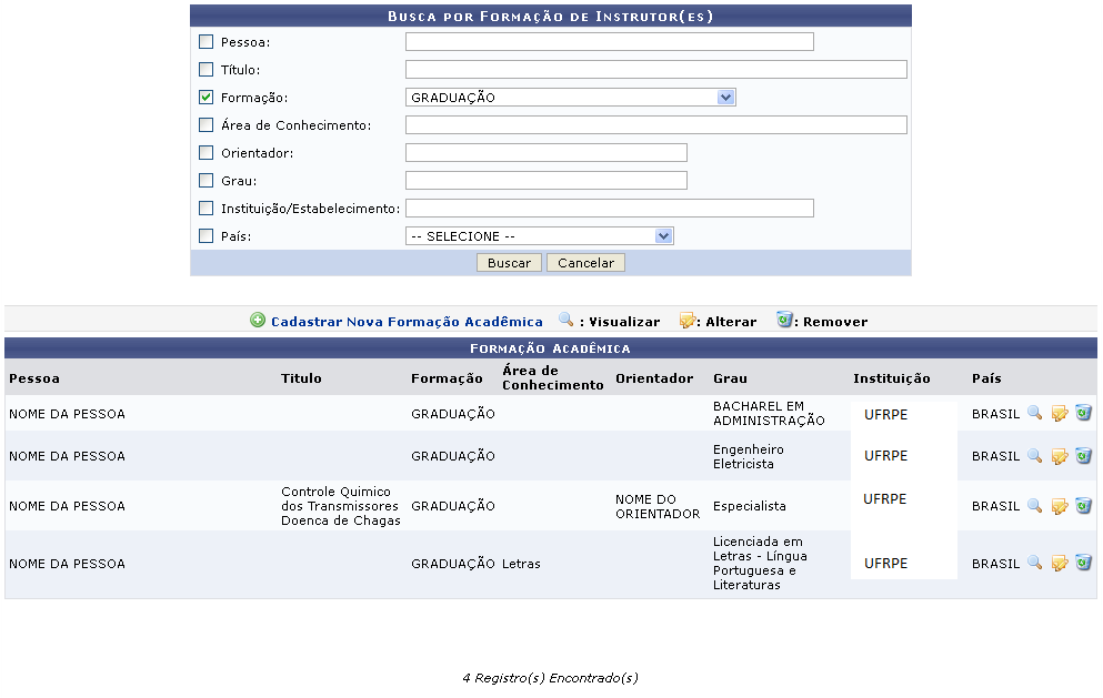 Realize a pesquisa por alguma Formação Acadêmica informando um ou mais dos seguintes campos, combinando-os para refinar a busca: