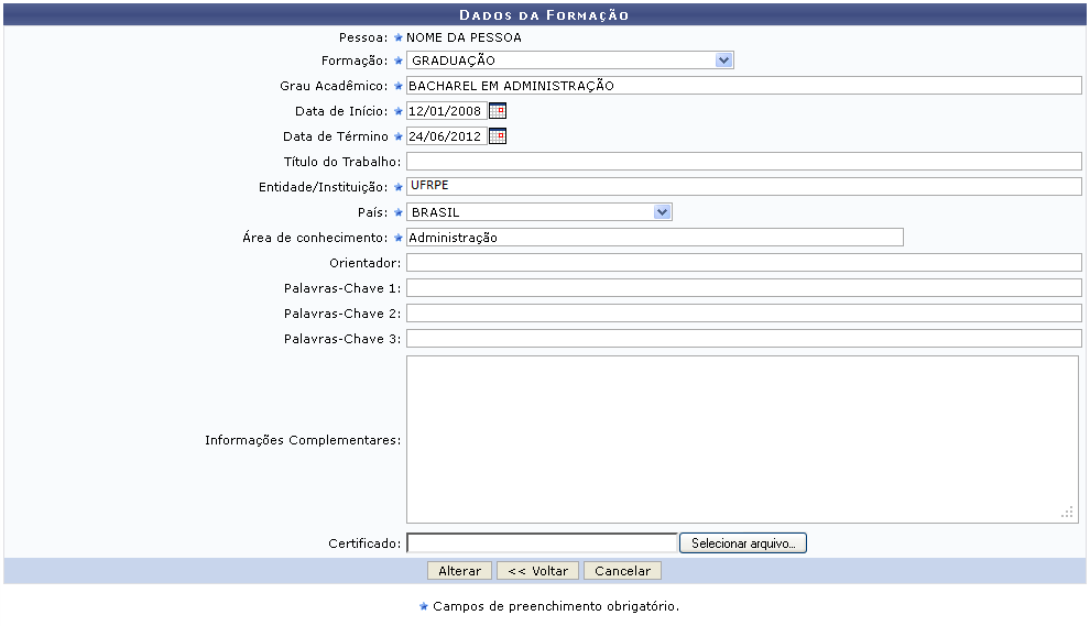 Esta funcionalidade permite ao usuário realizar a consulta e/ou modificação dos cadastros de uma formação acadêmica de determinada pessoa.